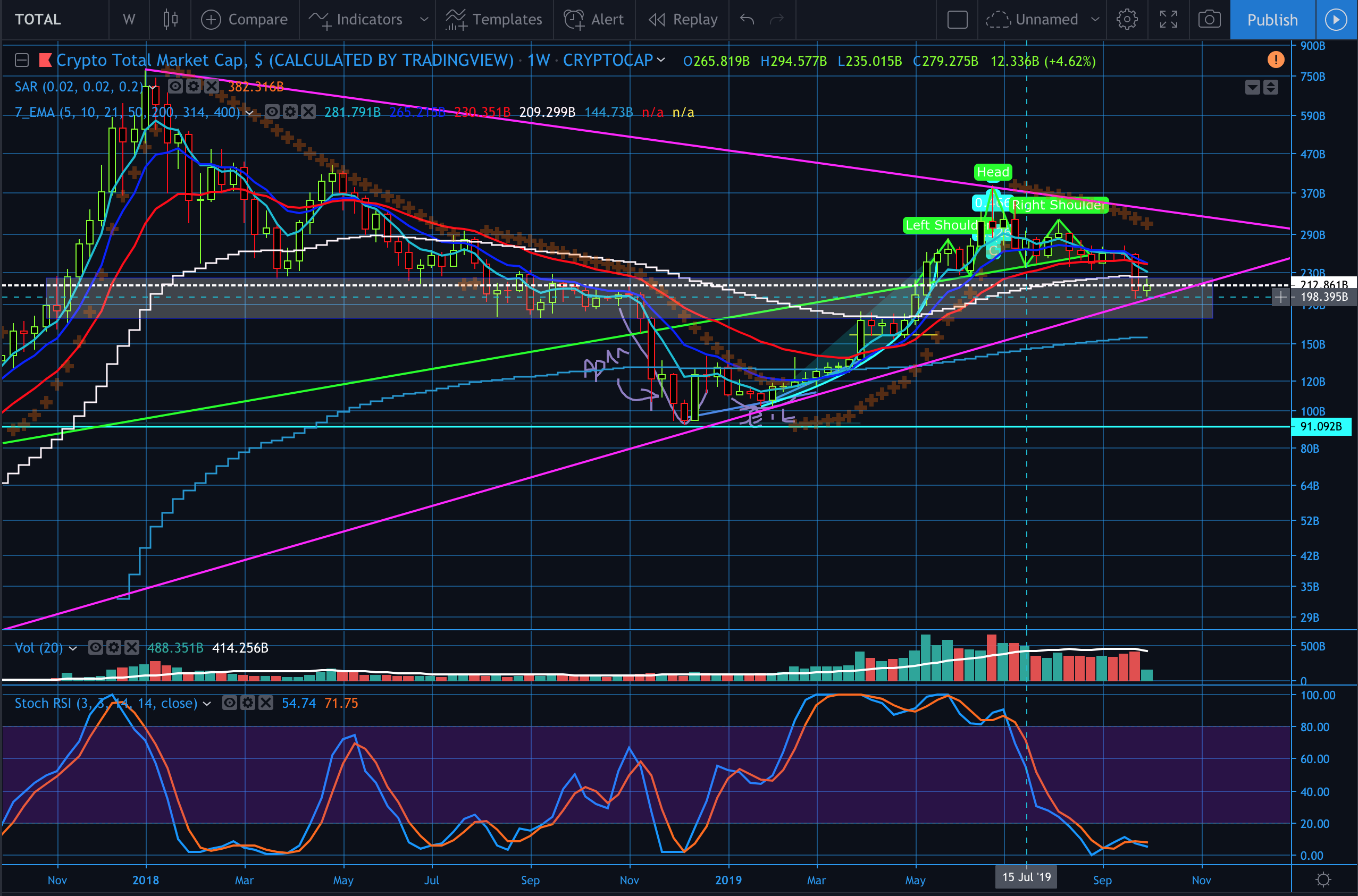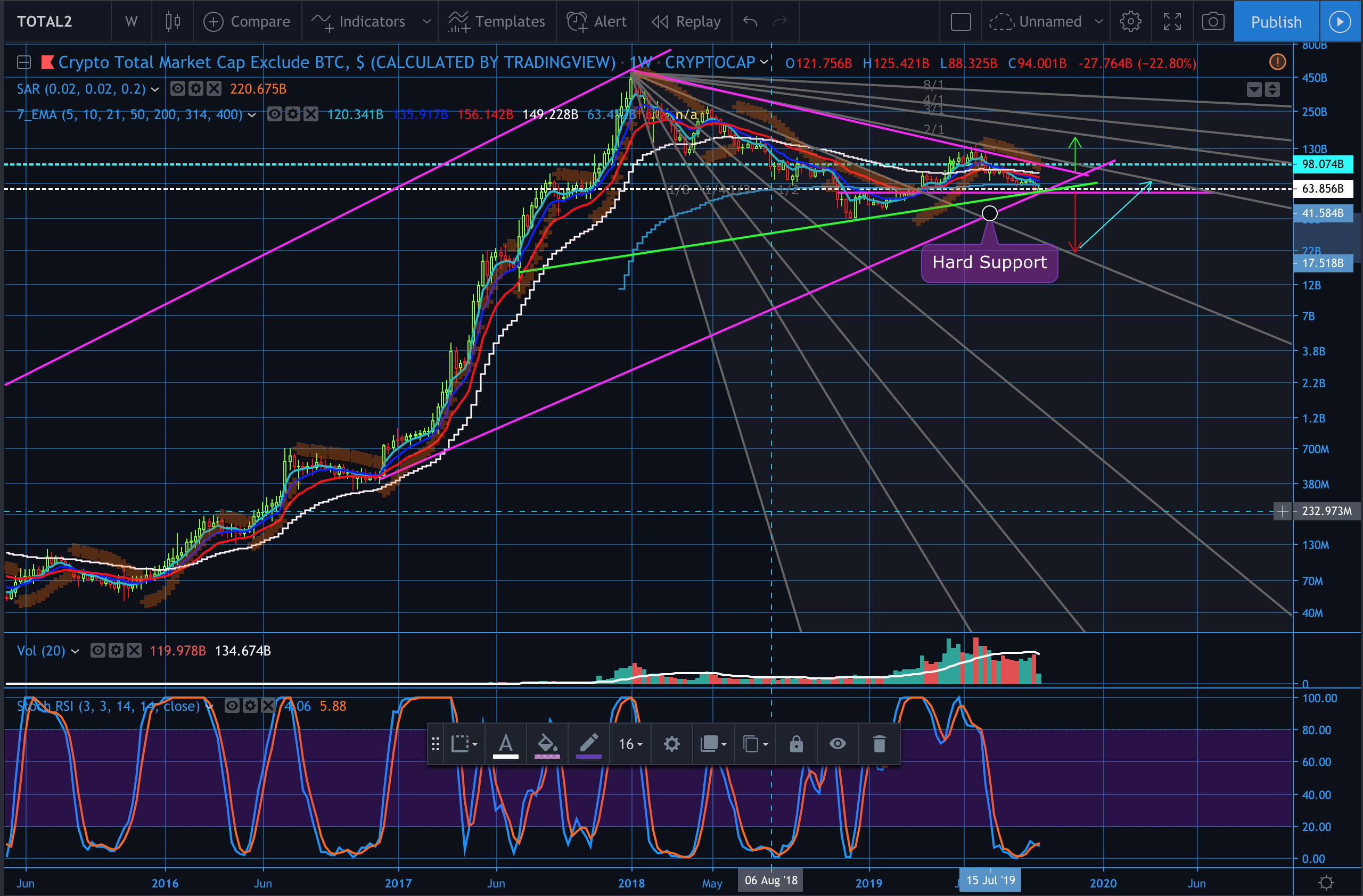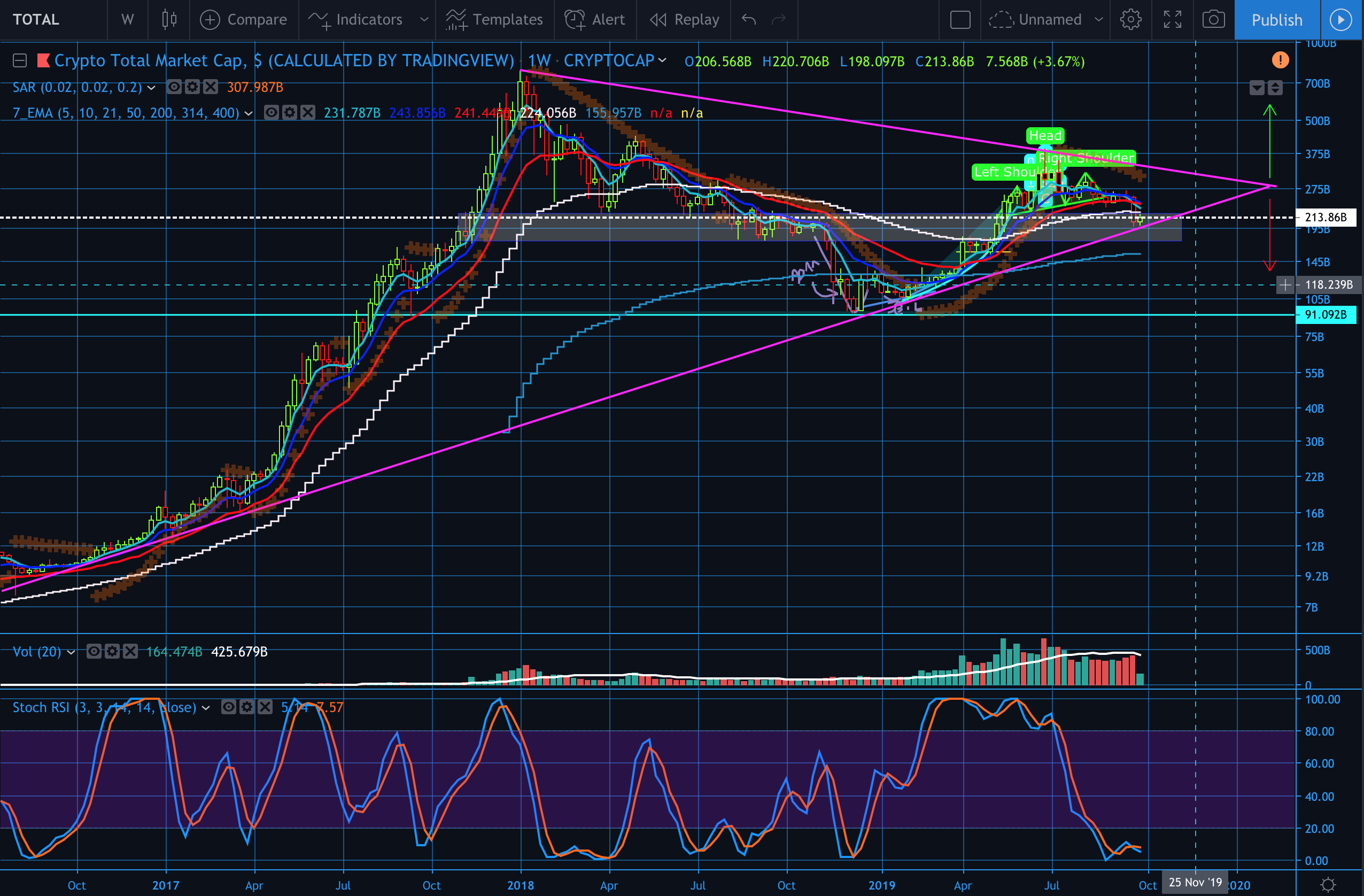 The Total Cryptocap is also in a symmetric triangle, of which seems to be sitting at the bottom of it as of now on the weekly chart. This support is hard support. If we break down from here we could see our way back to 91B, bringing us back to the bear market levels of earlier in 2018.
