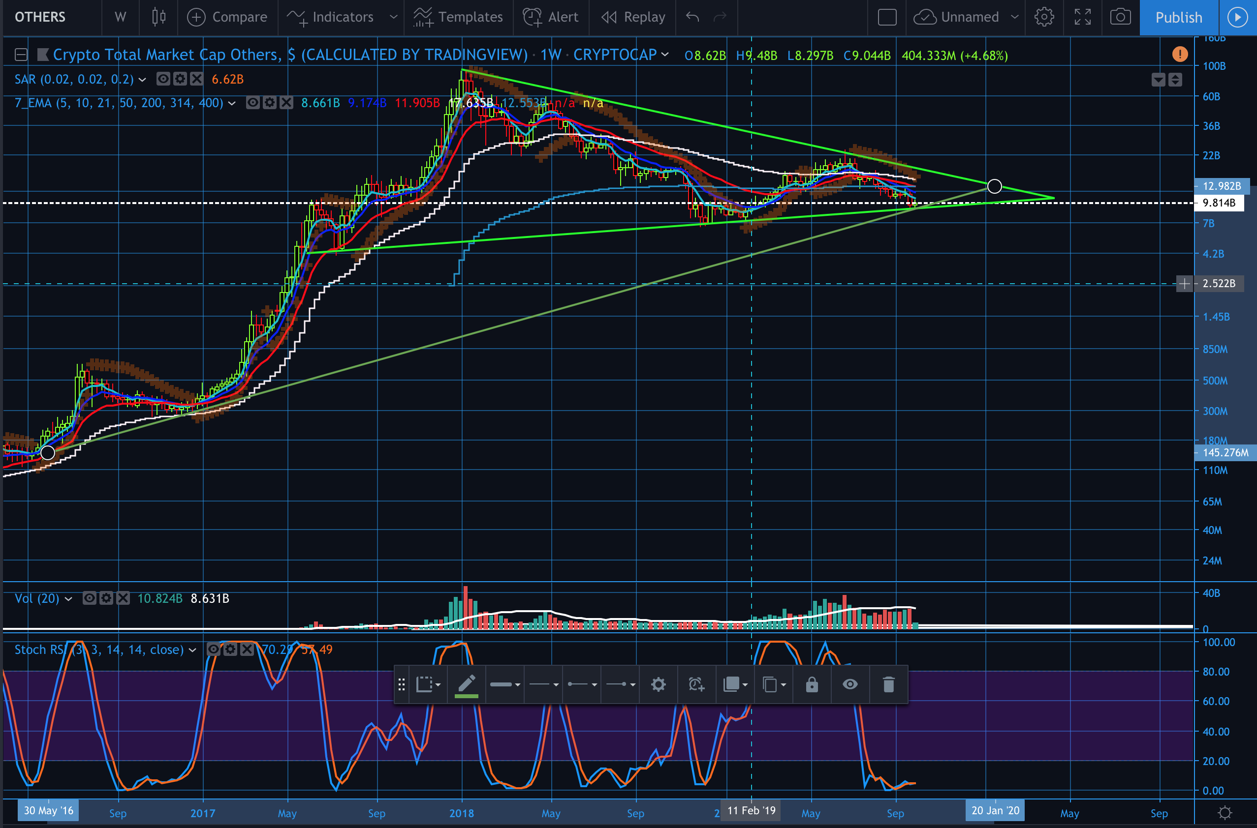 The Total Cryptocap Others is also in a symmetric triangle, of which seems to be sitting at the bottom of it as of now on the weekly chart. We could break out of it but the support is hard support at this level. If it broke it could fall to the 7B level. After that 4.2B. It is likely more probable that we move up rather than break down. A break move up would be a good look for the ALT market.