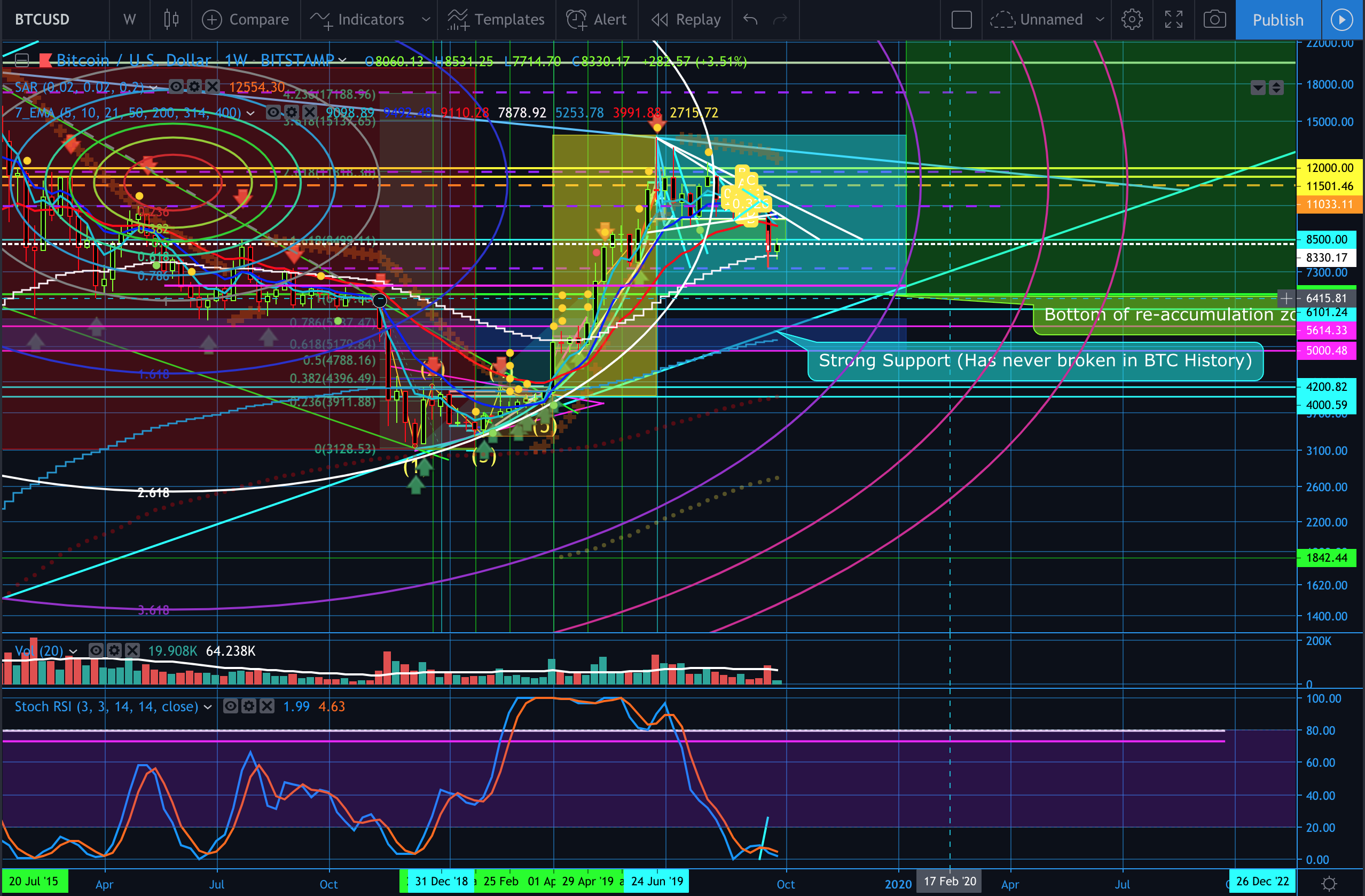BTC is in a re-accumulation as we have stated many times, after which should spark the next bull run (the green zone) moving into 2020. Ultimately BTC is still in a symmetric triangle in the macro scheme of things. Remember, the cyan line of support has never been broken in the history of BTC, we could hit that line and still be bullish.