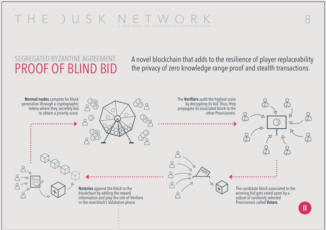 The Dusk Network uses a new consensus algorithm called Segregated Byzantine Agreement (SBA) which adds data to the blockchain. Each block has 3 rounds it must go through before it can be finalized onto the chain.