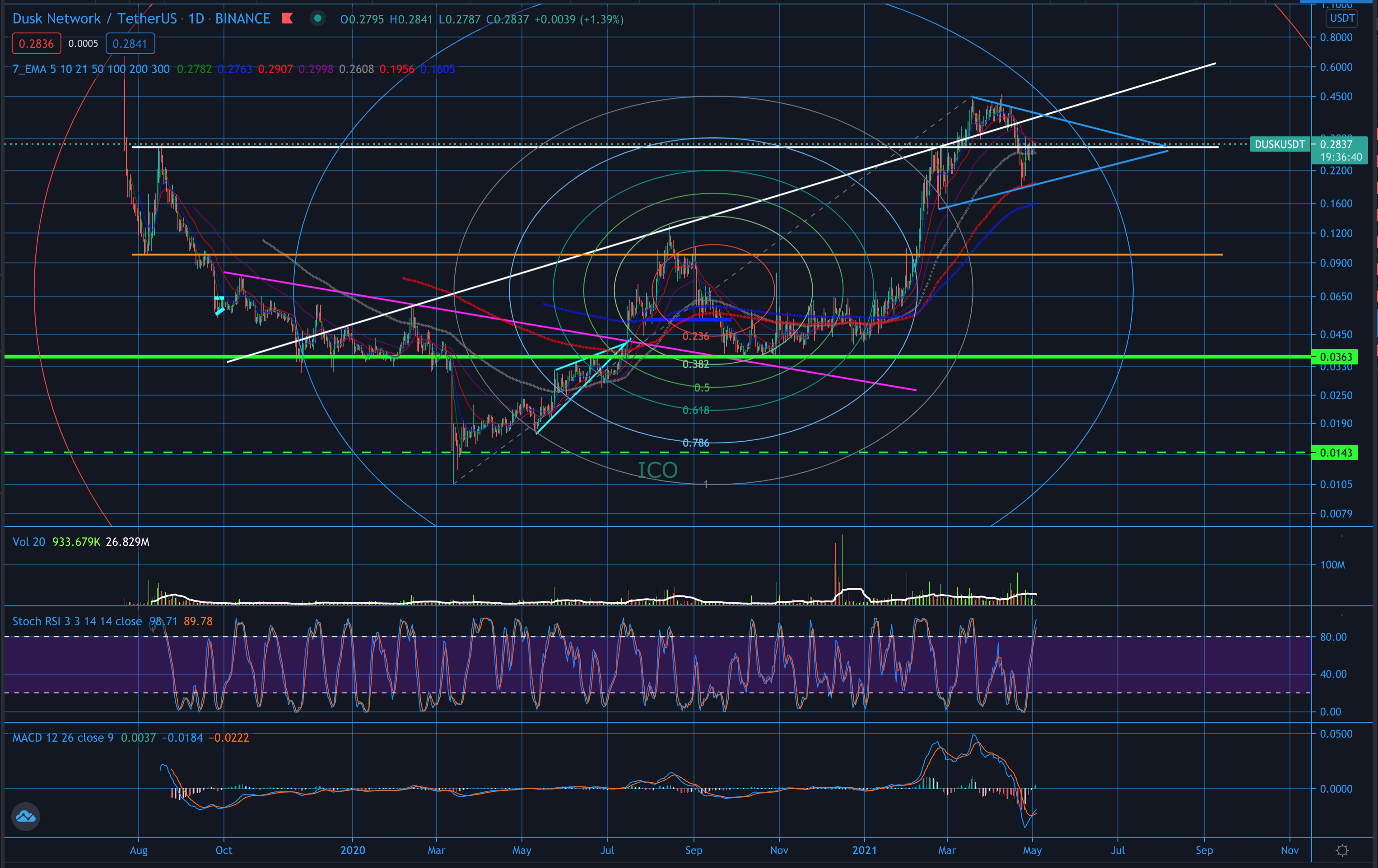 Taking a look below we can see that DUSK may be in a good place to accumulate as it looks to be forming a symmetric triangle. The white line above will act as a resistance point, but where the market is now with Bitcoin on the rise and what is looking like a new ALT cycle that is getting ready to make more upwards moves, if this breaks out to the upside we will see it move up, smashing through resistances fairly quickly and retest what would become new support. After which it would have a continuation upwards and onwards.