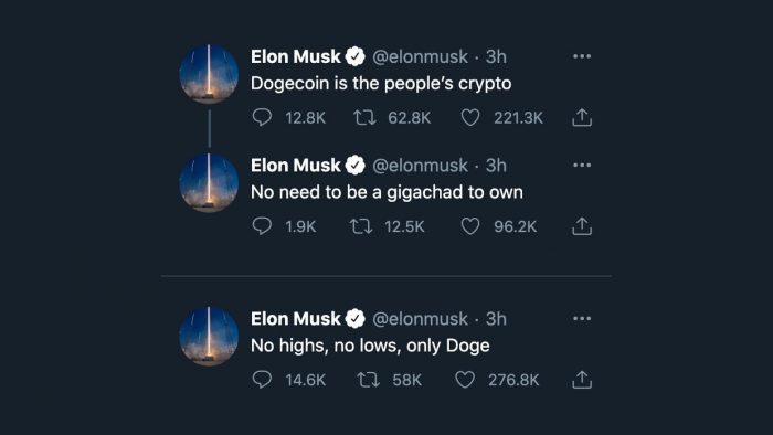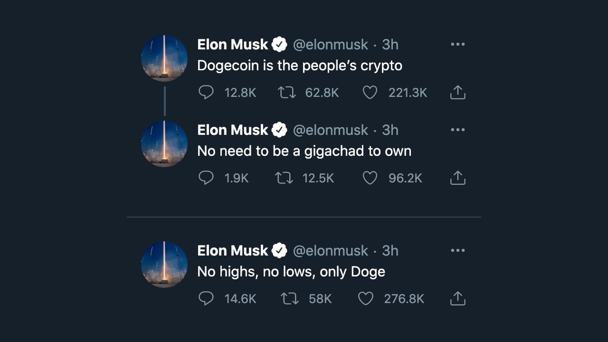 Tweets like these 2 examples among many, have moved the price of doge. People in the crypto markets need to always remember that these people who are not in the crypto markets and sort of loosely seem to dabble in it here and there, the more you give them power to move the market is the more they will and this goes both ways. On many occasions we have seen Elon flip flop. One minute he is driving prices up, the next he’s saying something to plummet the price down like he did on SNL as he called doge a “hustle”. So which is it? The people’s crypto? Or a hustle? I’m calling BS that every time he flip flops he claims to be joking, *teehee*.
