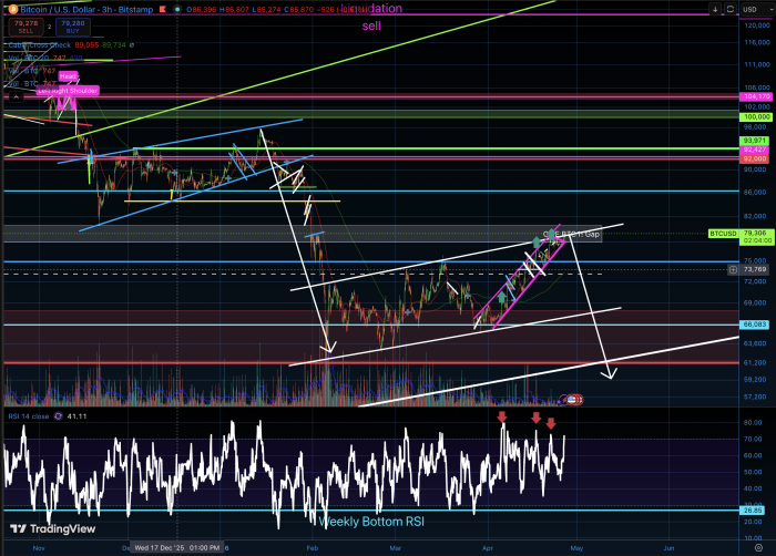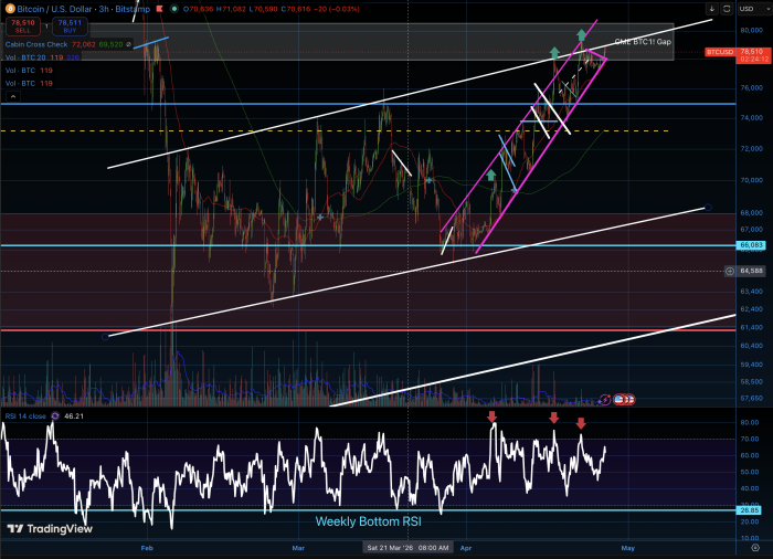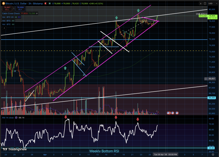 As the weekend of Apr 26 2026 wraps up. The bitcoin price is skirting the breakout line. It LOOKS bullish but remember, it is in a bear flag. With that said, there are some logistics we have to consider here.